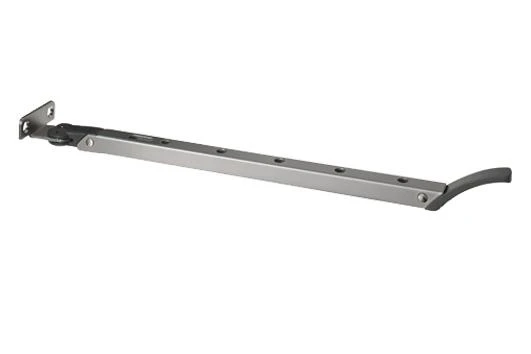 Raamuitzetter Habilis, staal grijs, kunststof grijs. Met de AXA raamuitzetter Habilis kan de openingsstand en ventilatie van een draairaam bepaald worden, 5 ventilatiestanden, windzeker, uitzetter kan bij wind niet van de pen glijden.