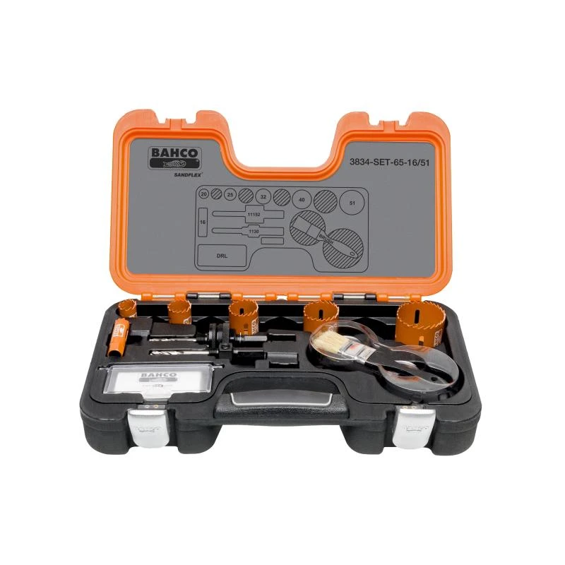 Assortiment SANDFLEX® bimetaal VIP gatzagen met de meest voorkomende diameters voor de machinebouwindustrie, installatie- en elektriciteitsbedrijven,Inhoud: 6 gatzagen serie 3830-vip 16 mm, 20 mm, 25 mm, 32 mm, 40 mm en 51 mm. 2 opnamehouders, 1 centreerboor, 1 inbussleutel en een spaanborstel. Verpakt in kunststof koffer.Het verdient aanbeveling om tijdens het zagen een veiligheidsbril te dragen.