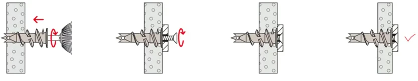 - Bij gipsplaten en of dubbele gipswanden met een boor Ø 8 mm voorboren.