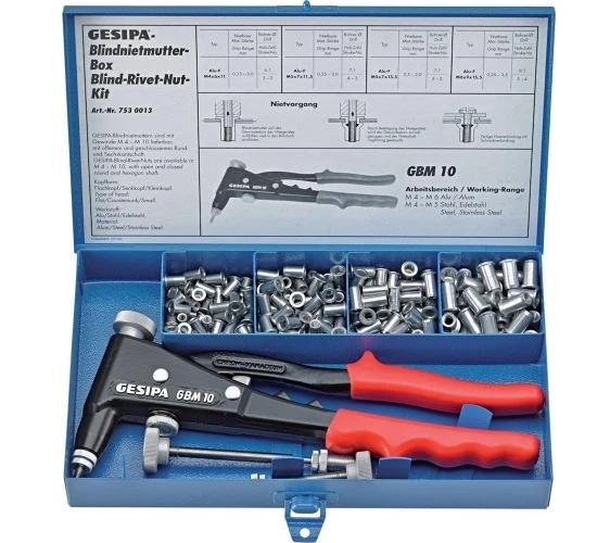 Popnageltang met assortiment popnagels. Inhoud: 1 popnageltang GBM 10, mondstukken en trekstangen M4, M5 en M6. Geschikt voor aluminium, staal, messing en roestvrijstalen popnagels M4 t/m M6. Verpakking: stevige metalen opbergkist.