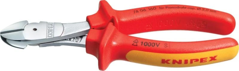 Volgens DIN ISO 5749. VDE/GS gekeurd 1000 V. Met aangesmede scharnierpen voor zeer hoge en duurzame belasting perfect geschikt voor alle draadsoorten, ook pianodraad grote snijcapaciteit bij geringe krachtinspanning door optimale afstemming van snijhoek,Kop: verchroomd. Benen: met tweekleurige meercomponentengrepen.VDE getest.