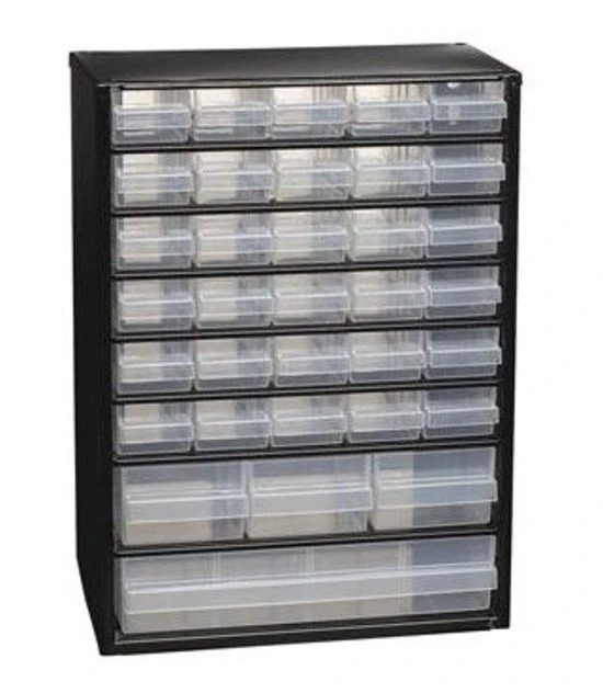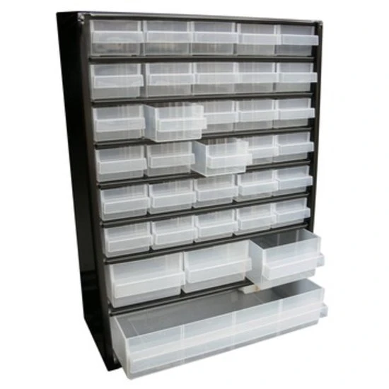 De Raaco Assortimentskast is ideaal voor het opbergen van al uw accessoires, u kunt hem aan de muur monteren of hem op de grond zetten. De metalen kast, bestaand uit een metalen behuizing en 34 kunststoffen laden, heeft genoeg ruimte om veel verschillende accessoires in op te bergen. In de kast vindt u 30 kleine laden, 3 middelgrote en 1 grote lade. Voor de kleine laden zijn er tussenschotjes meegeleverd, die u van boven in kunt schuiven.
