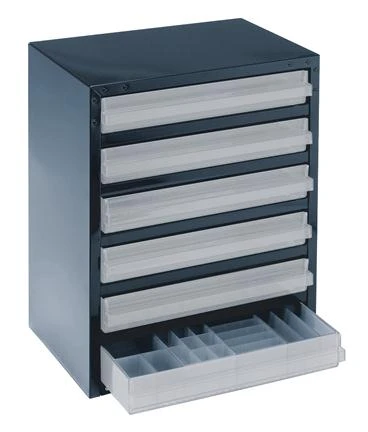 Assortimentskast van Raaco met 6 transparante laden, type 250-3 CL. Elke lade kan met behulp van inzetbakjes in vakken worden verdeeld. Kast van staal en laden van polypropyleen (PP).