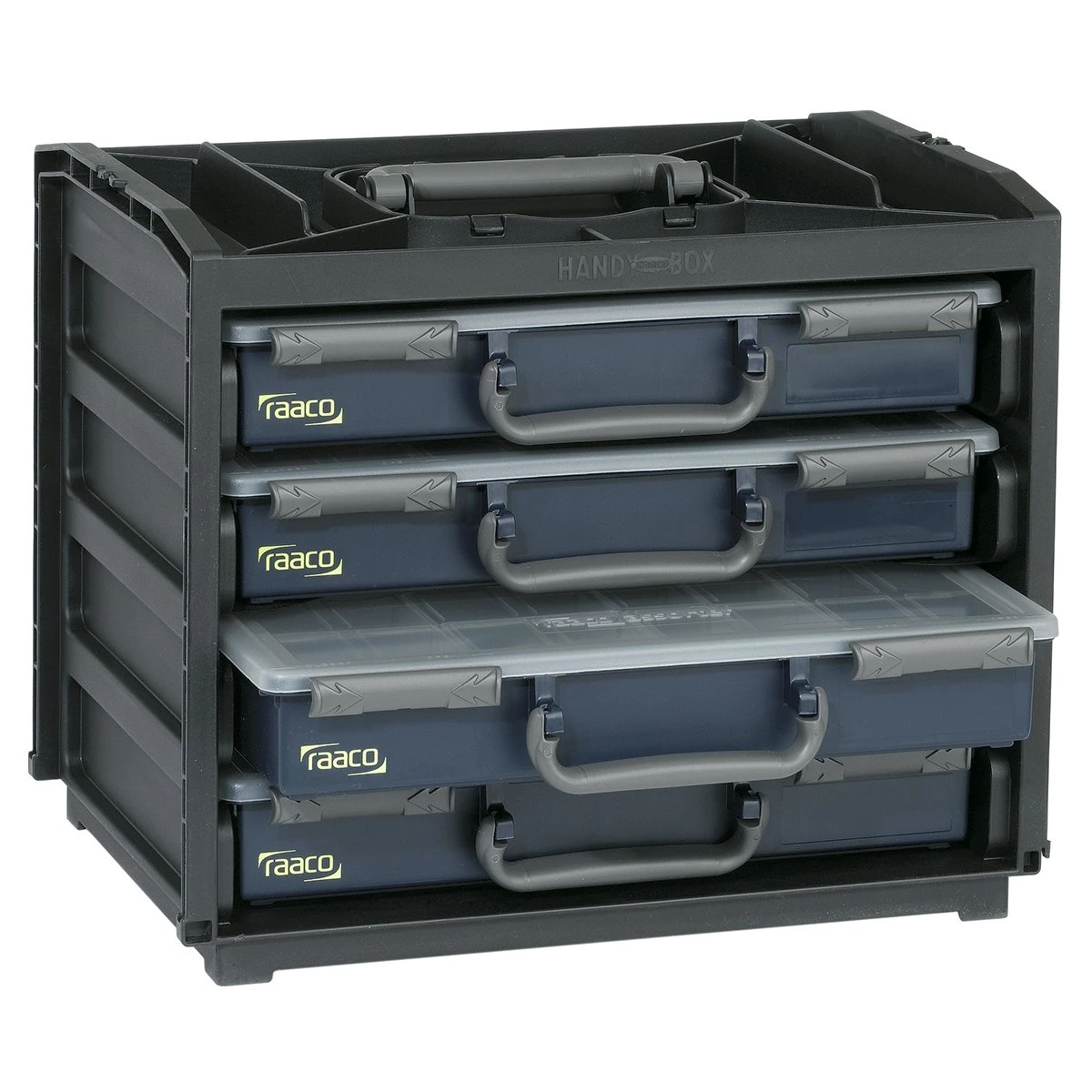 De Raaco Handy Box Silverline Met 4 Laden is ideaal voor het opbergen van al uw accessoires. De box zorgt ervoor, dat u zo veel mogelijk kunt opbergen in de 4 meegeleverde laden. Door een transparante bovenkant, kunt u altijd zien welke lade u nodig heeft en bespaart u veel tijd. Alle drie de laden zijn voorzien van een sterk hengsel, dat het product nog steviger maakt. In de Handy Box bevinden zich 4 x Profi Service Case 4-14, bestaande uit 12 kleine bakjes en 2 langwerpige.