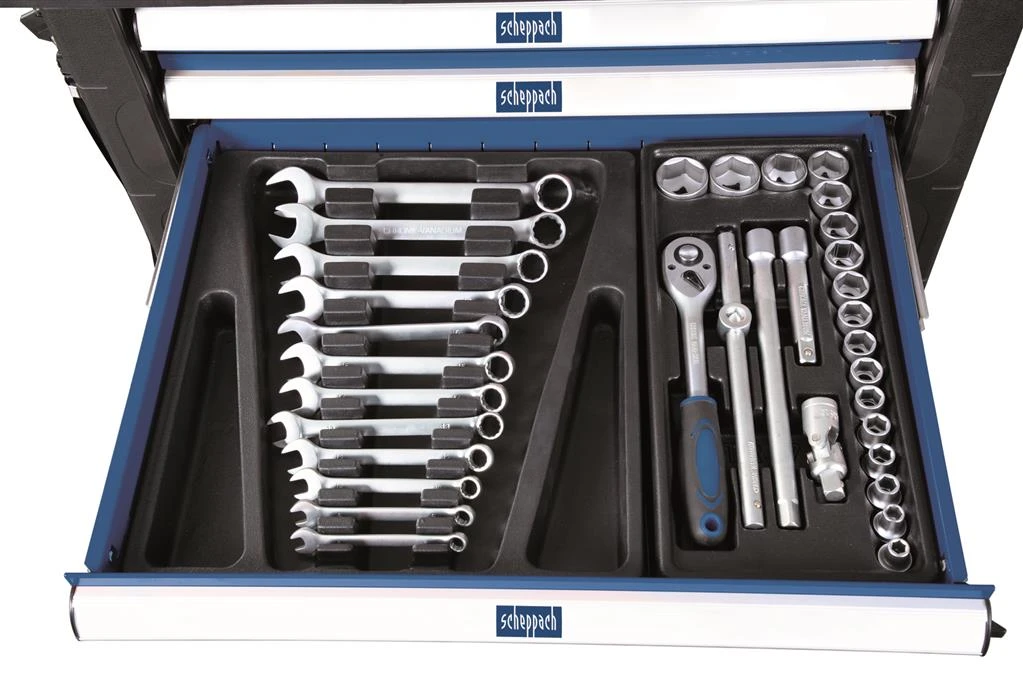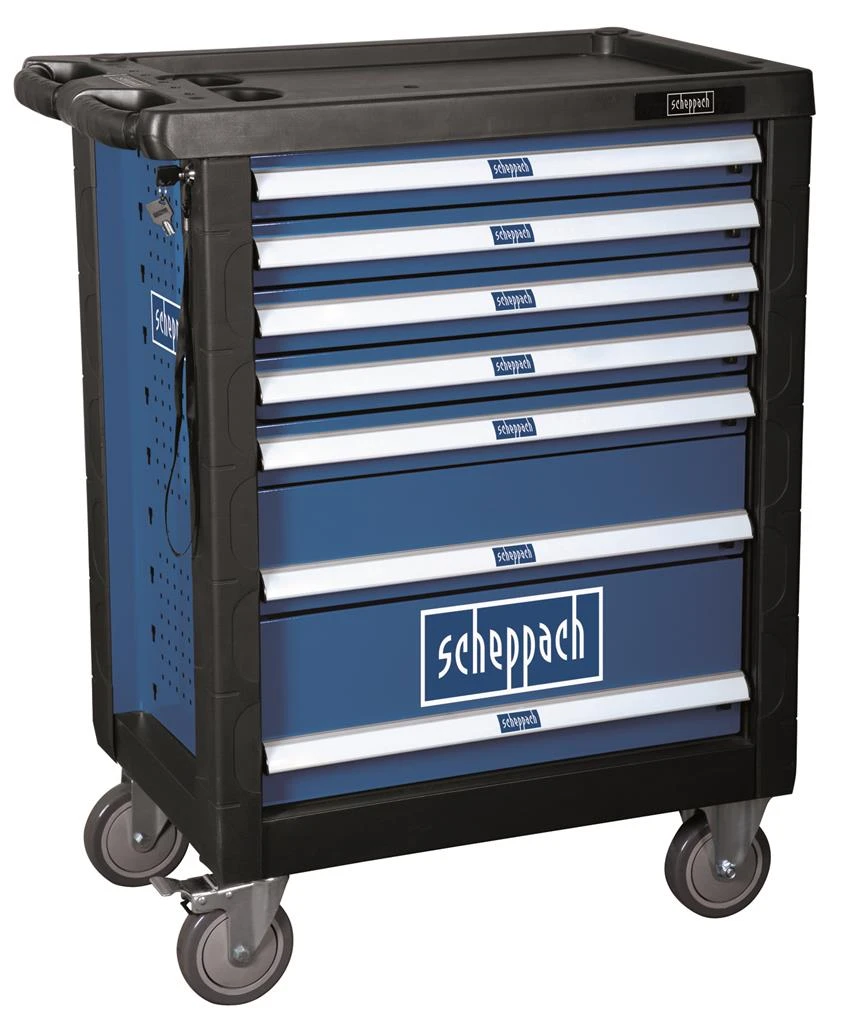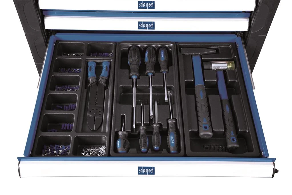 Altijd het juiste gereedschap. De Scheppach TW1000 gereedschapswagen is een compleet gevulde gereedschapswagen op wielen. De sterkte constructie wordt geleverd inclusief 263 tools! Met dit grote aantal gereedschap kun je veel kanten op. Elke tool heeft zijn eigen opbergmodule, waardoor alles eenvoudig is terug te vinden. De wielen hebben een remstand en zijn flexibel te bewegen. Verder beschikt de TW1000 over 7 “easy-pull” laden. De inhoud bestaat uit de volgende gereedschappen: hamers, combinatiesleutels, sleufschroevendraaiers, borgringtangen, ratelsets, geïsoleerde schroevendraaiers, precisie schroevendraaiers, inbussets, krimpgereedschap, kruiskopschroevendraaiers, punttang, combinatietang en zijkniptang.