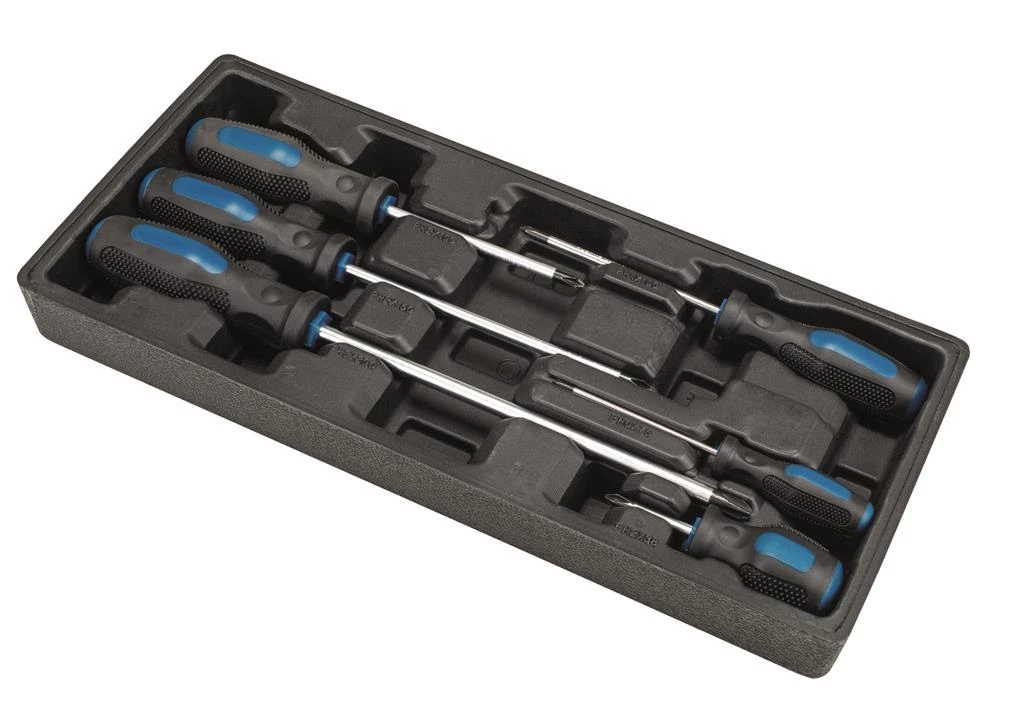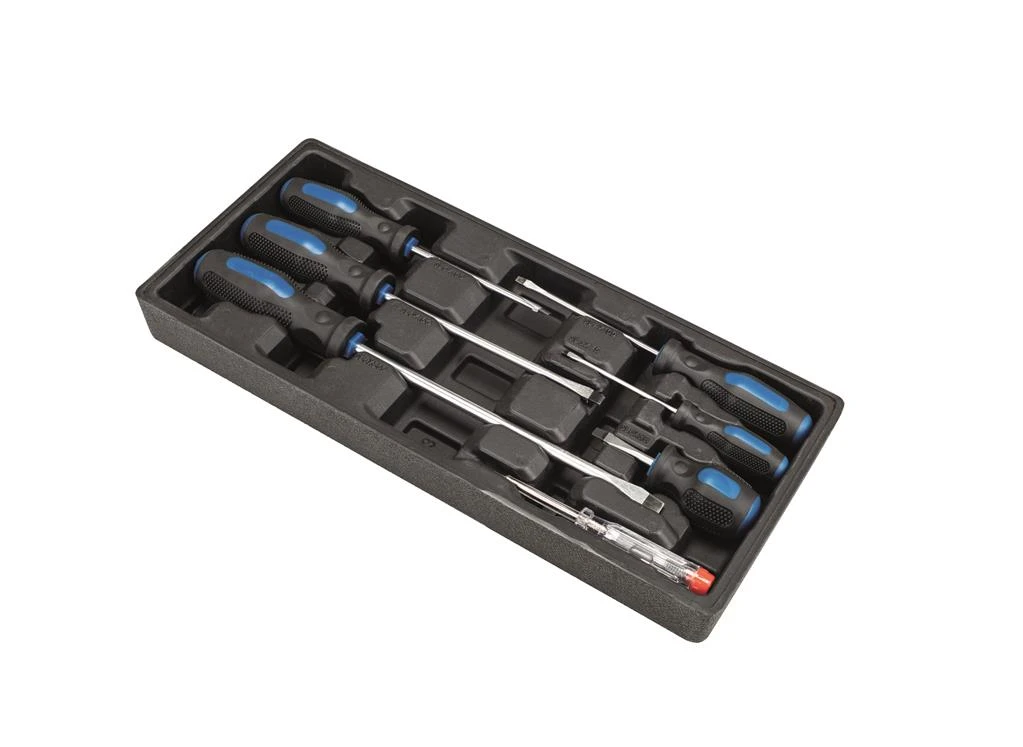 - 6x sleufschroevendraaiers: 1 spanningzoeker, maat 4×100, maat 5×100, maat 3×75, maat 6×150, maat 6×38, maat 8×200