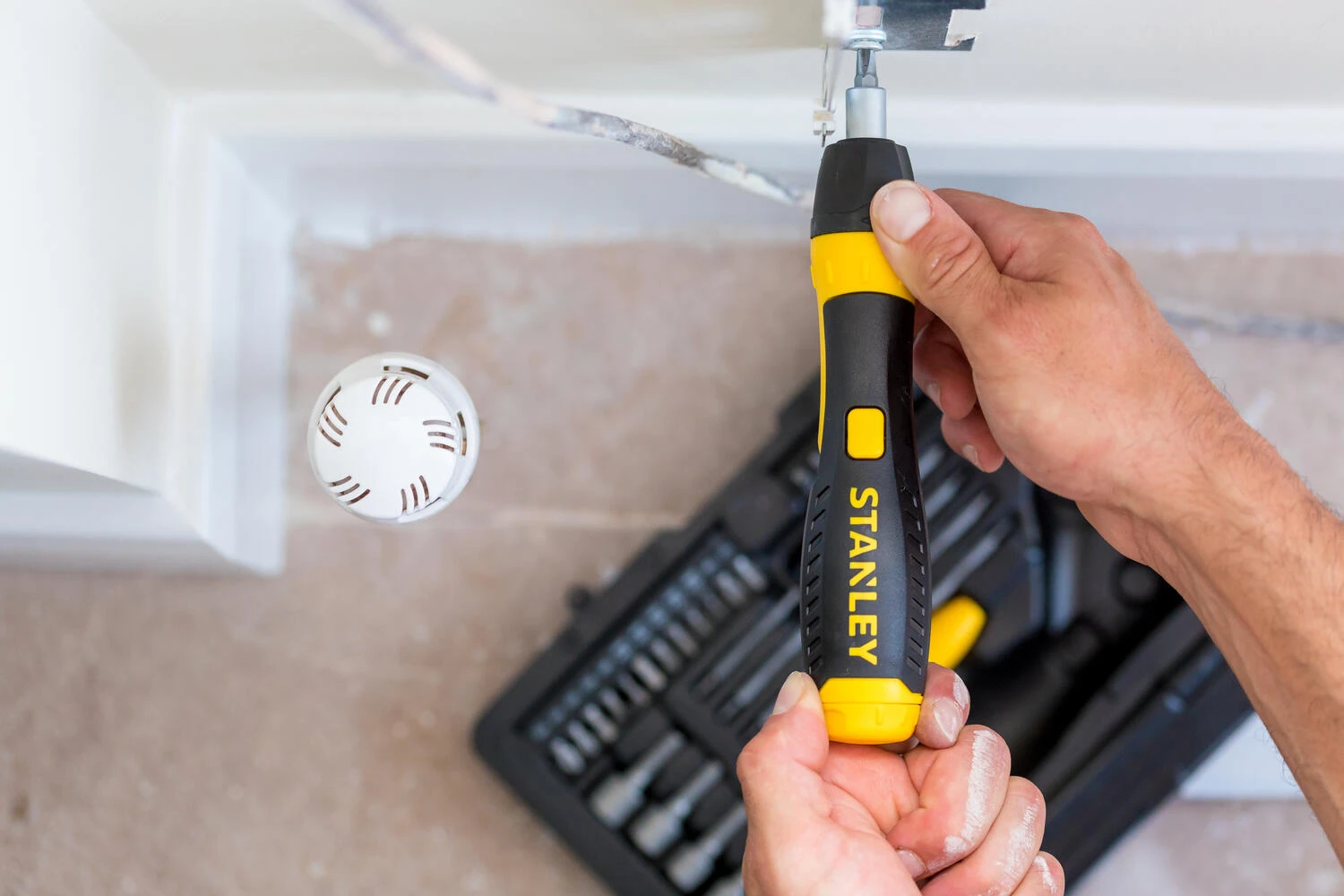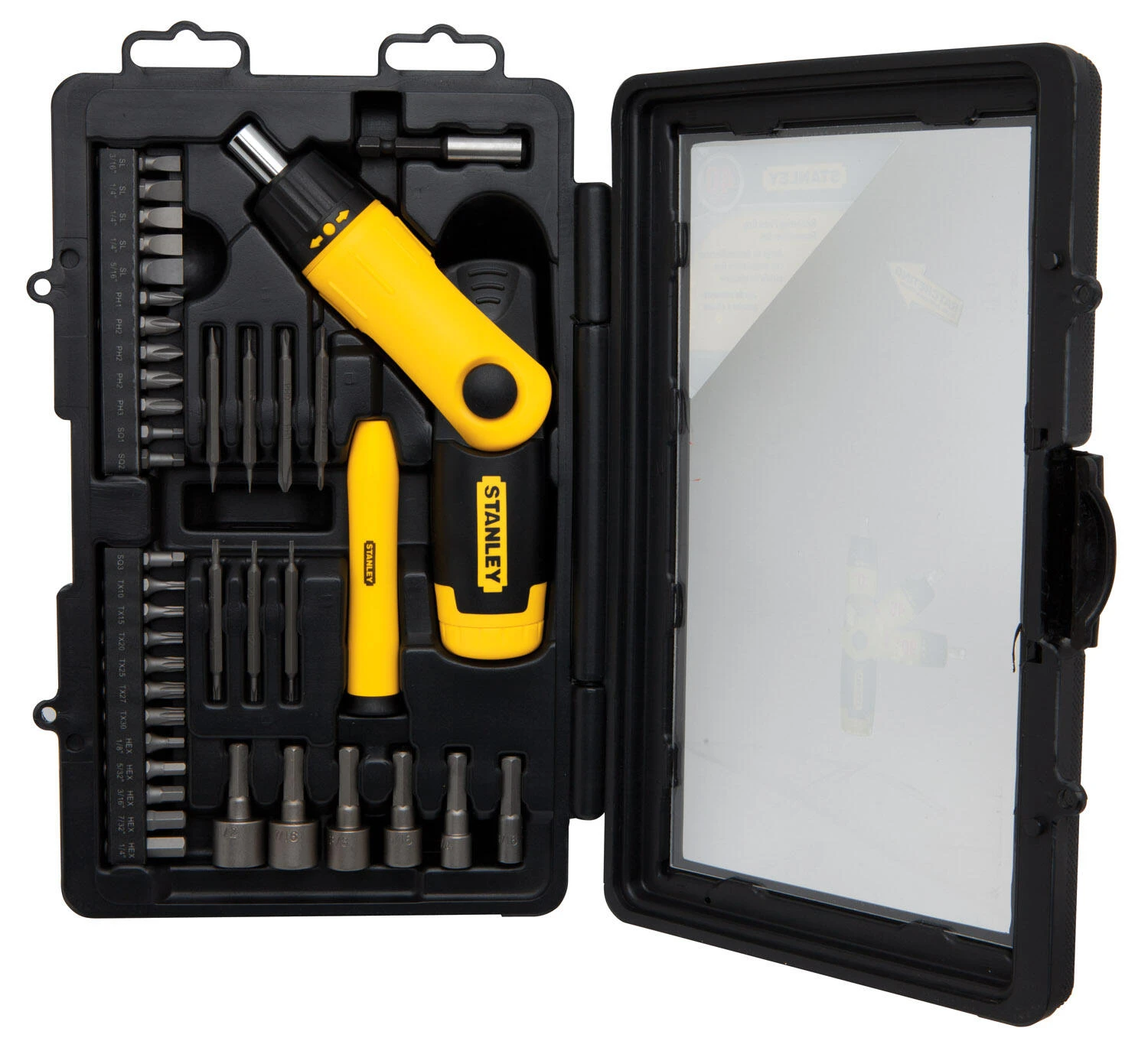 Dit is de Stanley 40-Delige Pistoolgreep Ratel-Bit-Set. De set heeft 1 plooibare pistoolgreep ratel-bit en 1 verlengstuk.