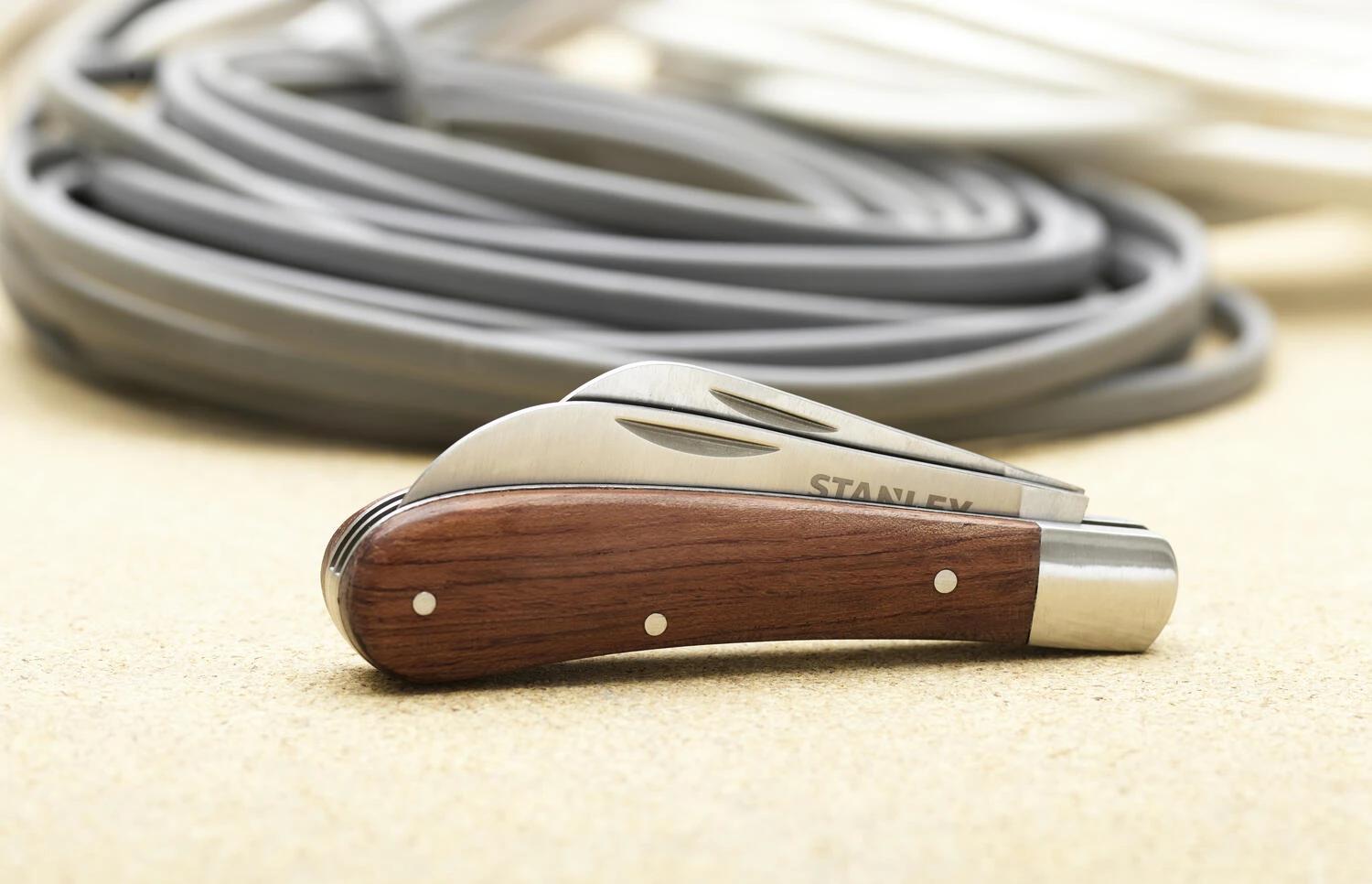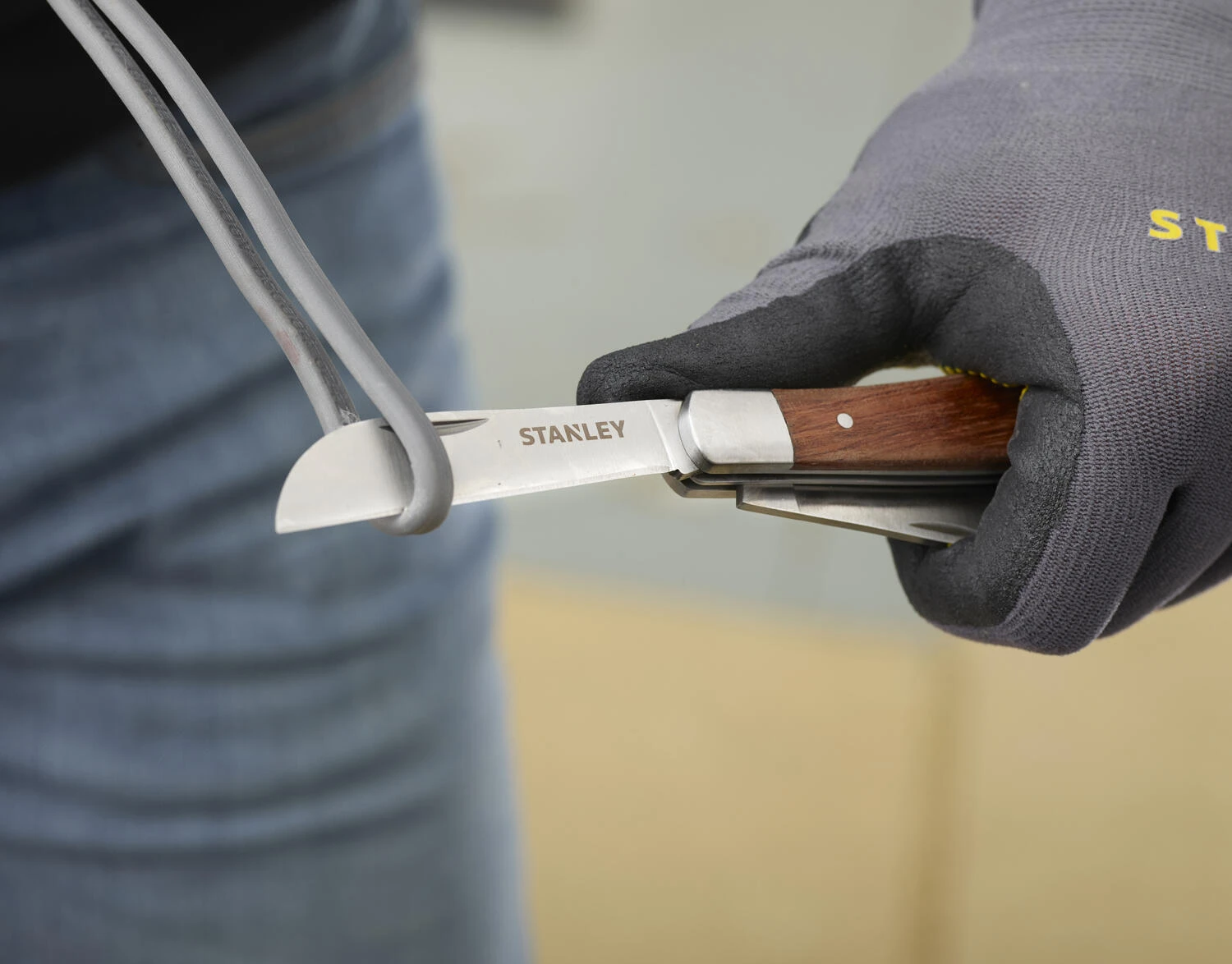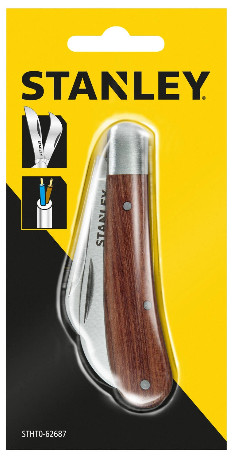 Dit Stanley elektriciteitsmes heeft bladen gemaakt van koolstofstaal voor een langere levensduur. Het mes heeft een dubbel lemmet in een traditioneel design voor snijden en strippen van geïsoleerde kabels. De houten handgreep heeft een eenvoudig design dat zorgt voor meer comfort en een optimale grip.
