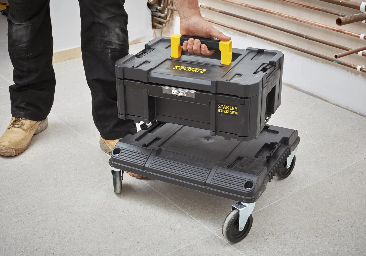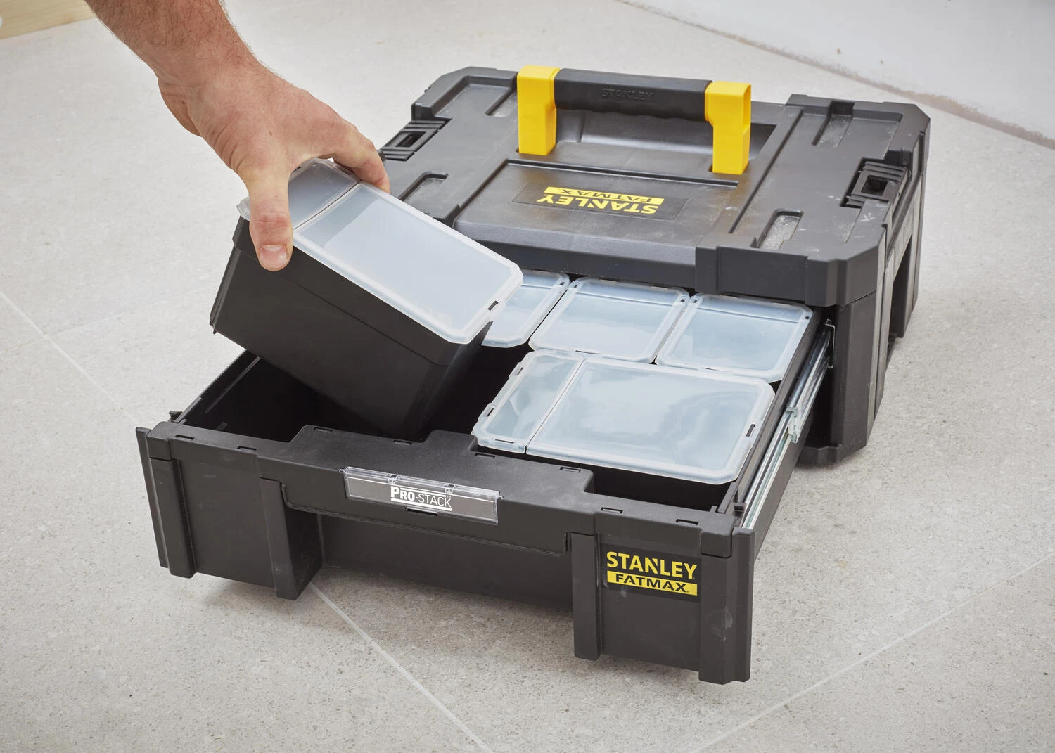Deze Stanley Tstak is geschikt voor het transport van accessoires. De koffer is uitgerust met 6 afgesloten, uitneembare bakjes (2 grote / 4 kleine). Lade schuift 100% open dankzij metalen schuifsysteem voor vlotte toegang tot de gereedschappen en accessoires.