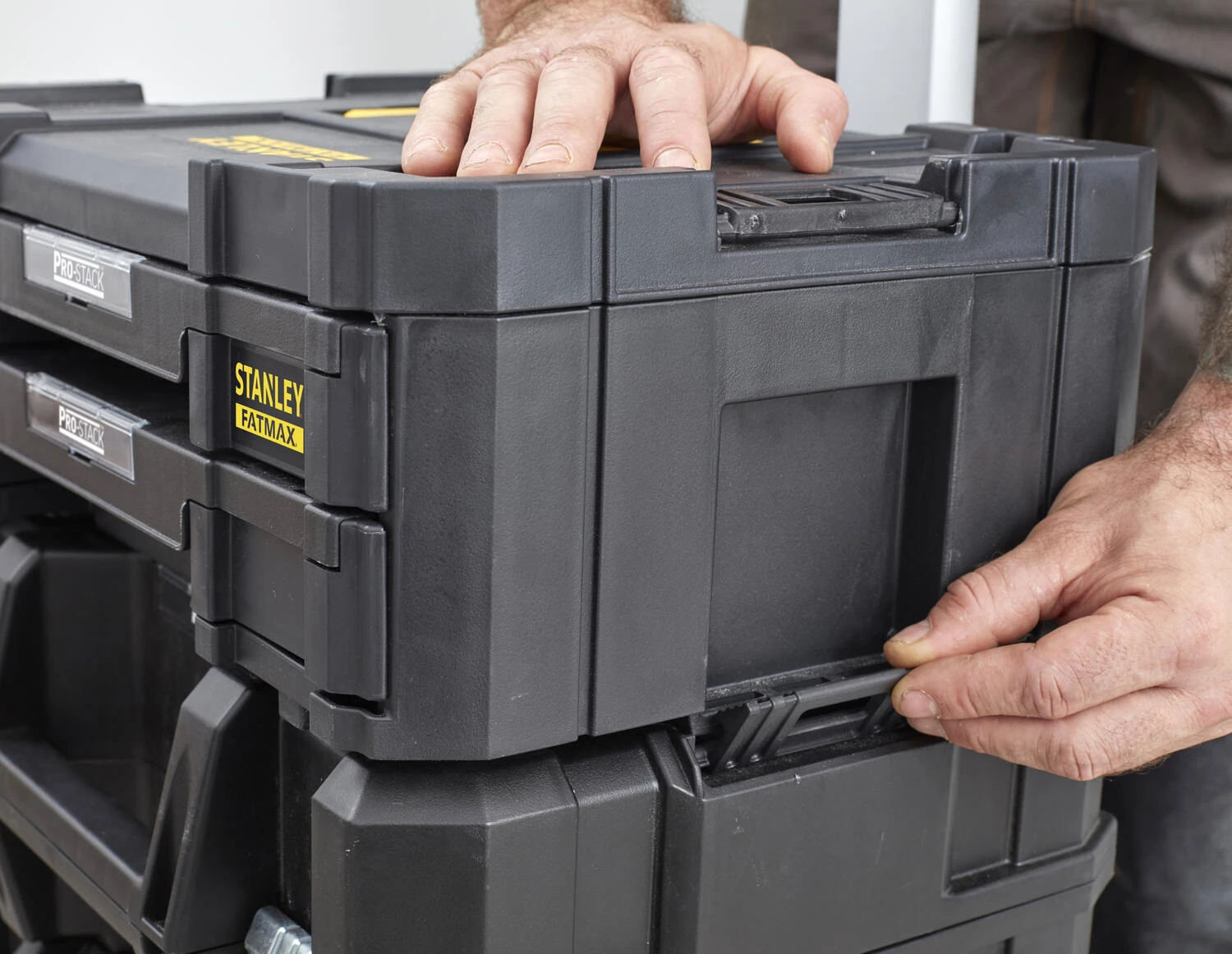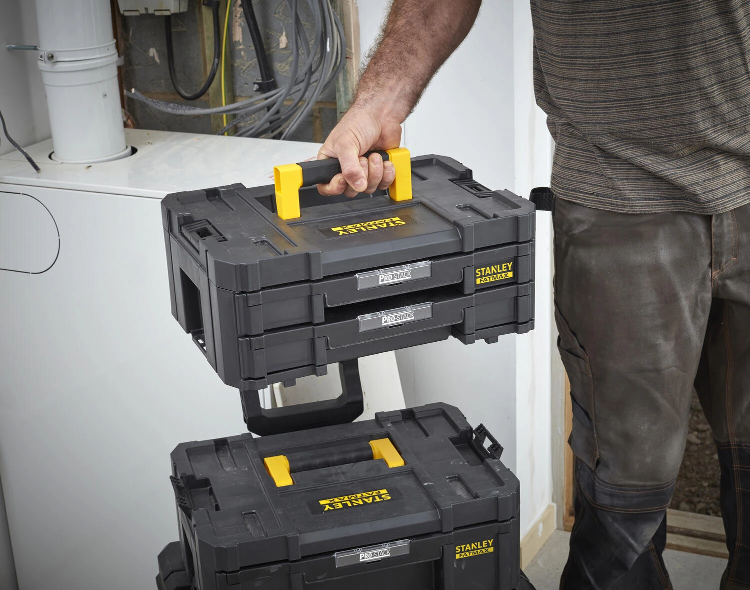 Deze Stanley Tstak is geschikt voor het transport van accessoires. De koffer is uitgerust met 2 ondiepe lades met moduleerbare compartimenten. De lades schuiven 100% open dankzij metalen schuifsysteem voor vlotte toegang tot de gereedschappen en accessoires.