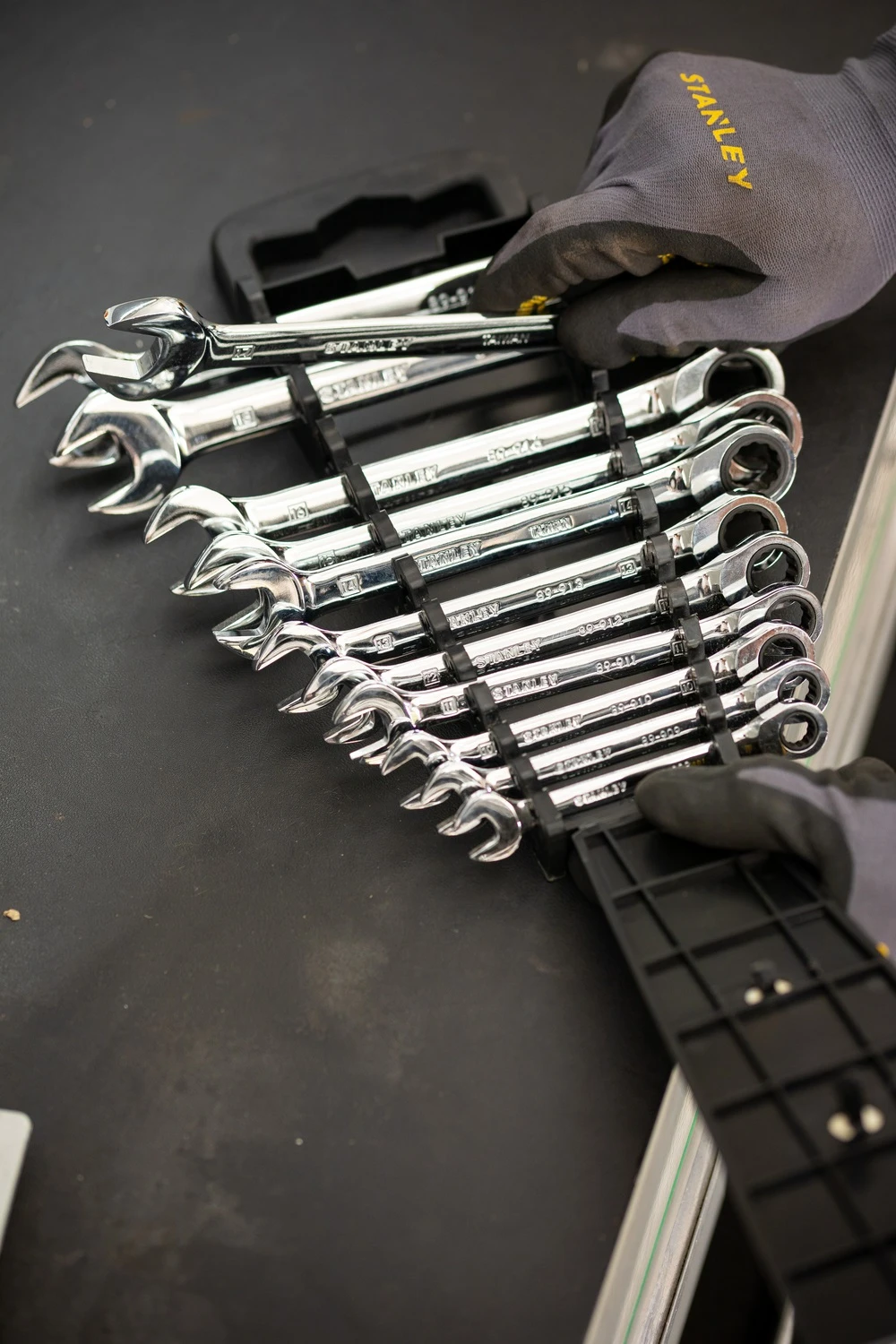 Deze Stanley ratelringsteeksleutelset bevat 12 ratelringsteeksleutels met de afmetingen 8, 9, 10, 11, 12, 13, 14, 15, 16, 17, 18, 19 mm. Ze zijn gemaakt van glanzend chroom en zijn van hoge kwaliteit. Doordat er 12 maten zijn hebt u altijd de perfecte ratelringsteeksleutel bij u!