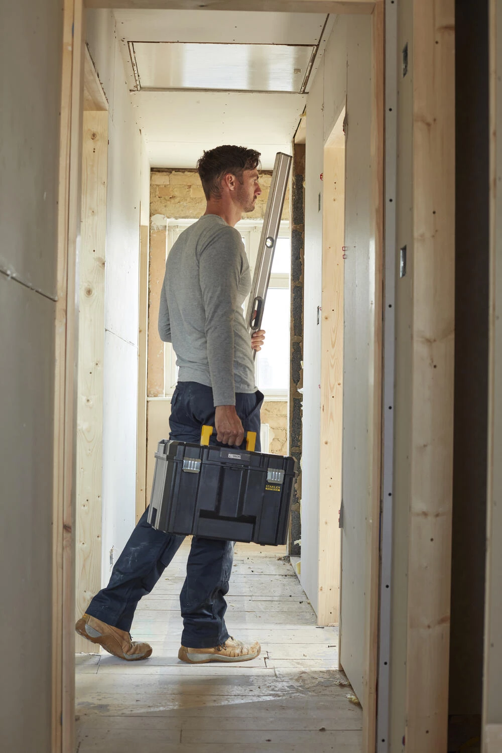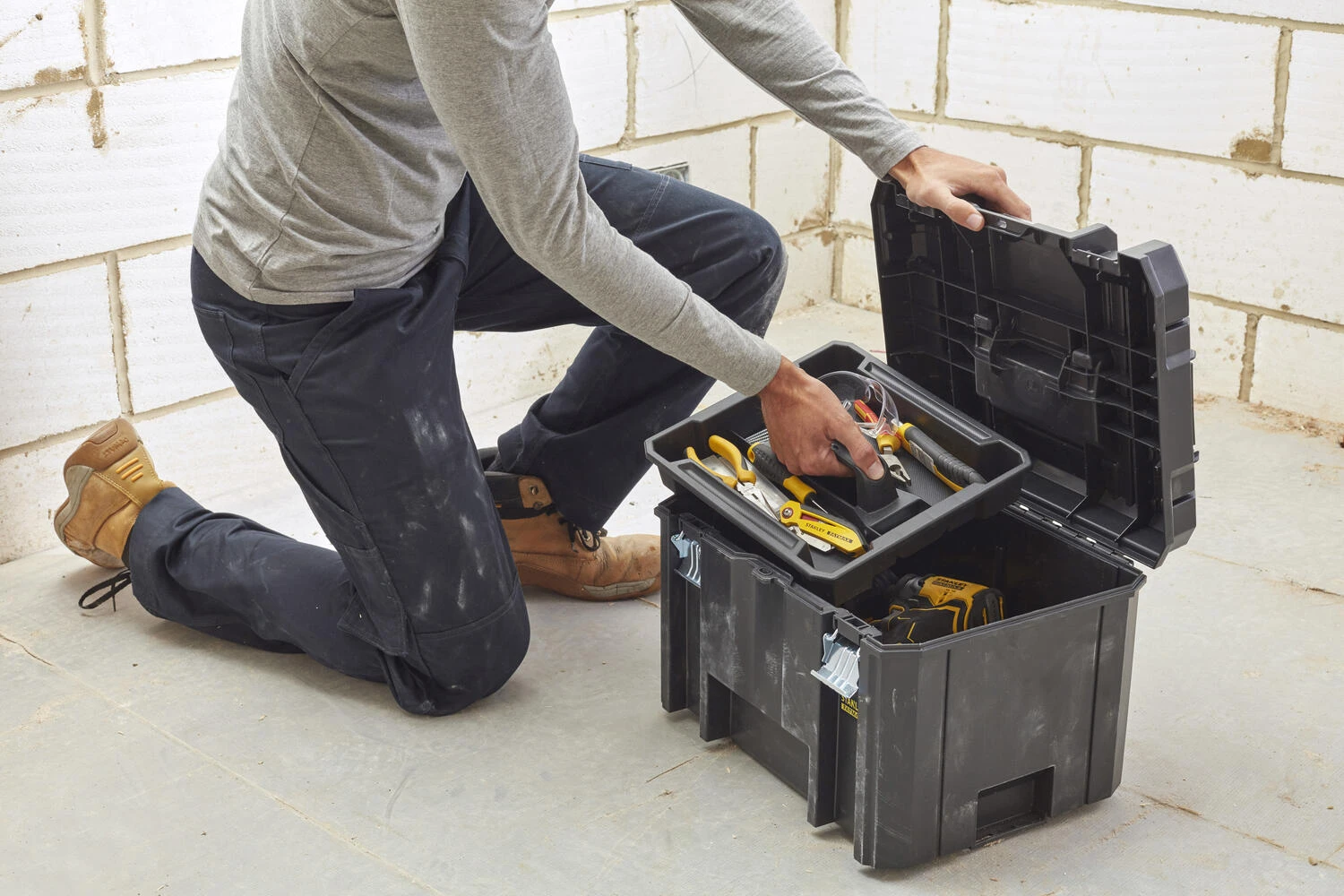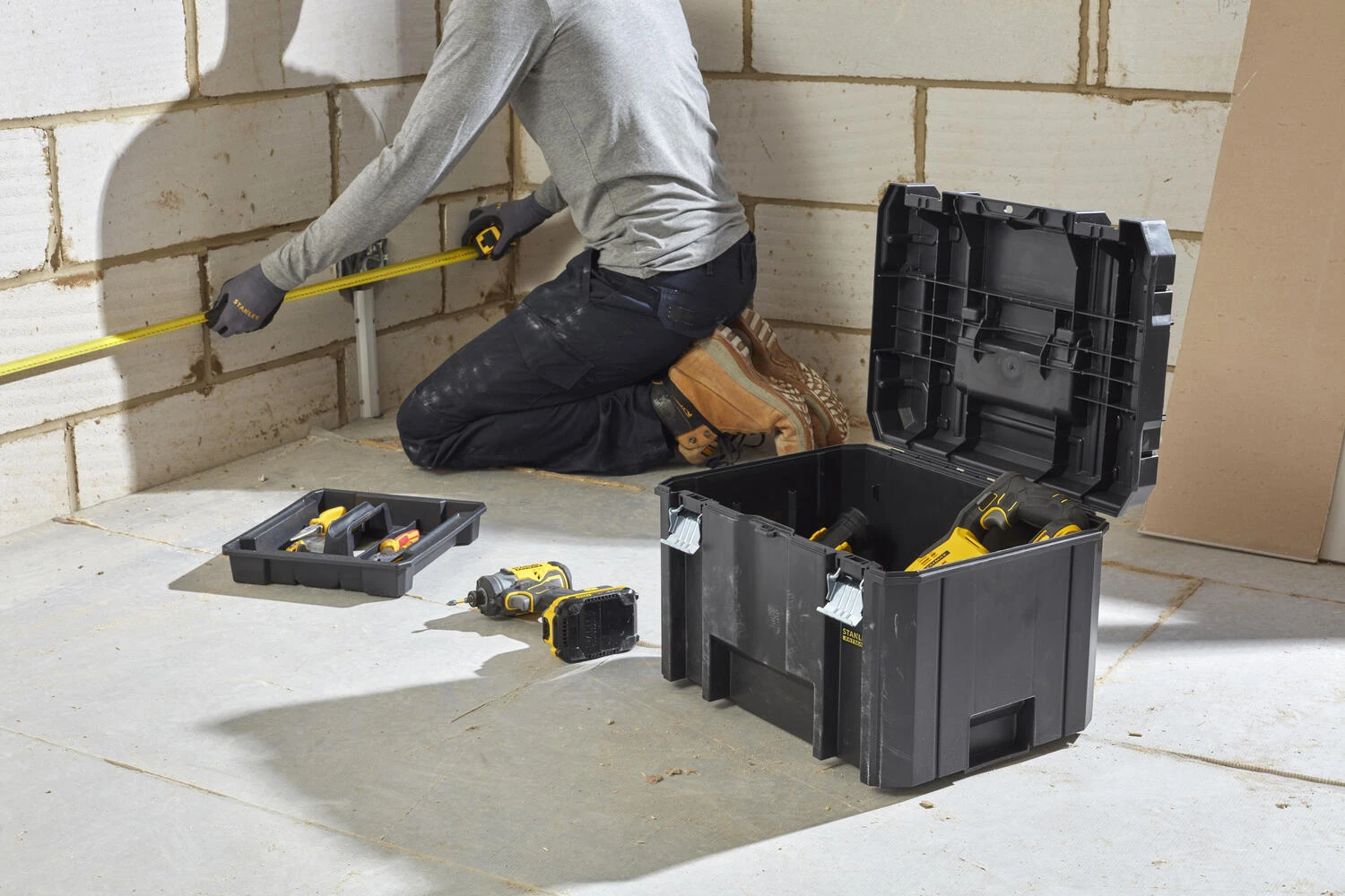 Deze Stanley Tstak gereedschapskoffer is perfect voor transport van grotere elektrische gereedschappen en handgereedschap. Hij beschikt over een uitneembaar gereedschapsbakje, handig voor kleiner gereedschap of onderdelen. Met een draagvermogen van 30kg kan deze koffer een boel hebben.