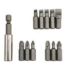 Standaard uitvoering.12-delige set, bestaande uit magnetische bithouder en 11 bits gesorteerd.Aandrijving 1/4 inch zeskant.Samenstelling:- bithouder 2426,- bit voor gleufkop 4.5 x 0.6 mm, 5.5 x 0.8 mm, 5.5 x 1.0 mm, 6.5 x 1.2 mm en 8.0 x 1.6 mm,- bit voor Phillips kruiskop nr. 1, nr. 2 en nr. 3,- bit voor Pozidriv kruiskop nr. 1, nr. 2 en nr. 3.