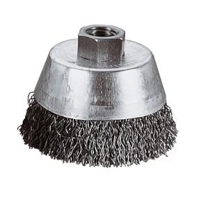 Kom model. ROESTVASTSTAAL. Voor haakse slijper. Gegolfde staaldraad. Om te ontroesten, ontbramen, polijsten en reinigen. Moer met binnenschroefdraad M14.