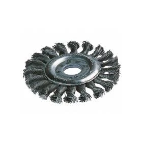 Rond, plat model. Voor haakse slijper. Gevlochten (getordeerde) staaldraad. Om te ontroesten, ontbramen, polijsten en reinigen.